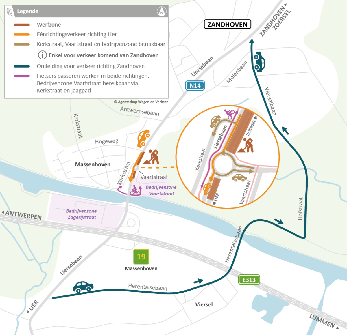 Op de N14 geldt eenrichtingsverkeer naar Lier voor het gemotoriseerd verkeer, van vlak na de Hogeweg tot aan de op- en afrit van de E313. De Hogeweg blijft bereikbaar en kan je in- en uitrijden. De Kerkstraat en Vaartstraat zijn bereikbaar via de nieuwe rotonde komende vanuit Zandhoven.