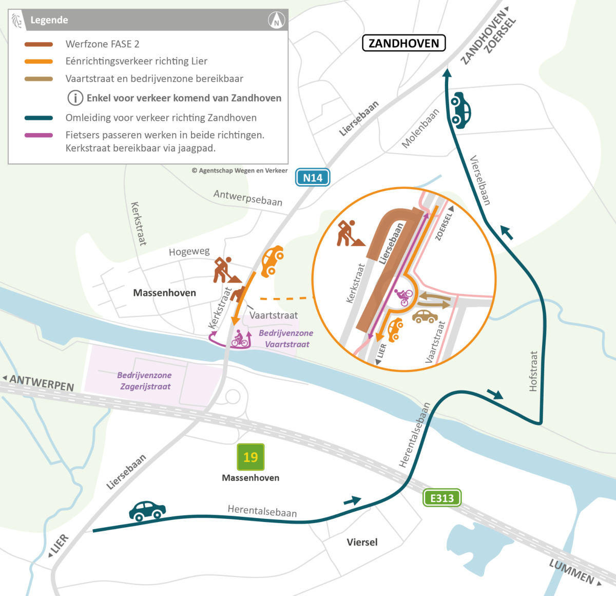 Verkeer van Lier of van de E313 naar Zandhoven volgt een omleiding via de Herentalsebaan, de Hofstraat, de Vierselbaan en de N14. Verkeer op de E313 van Antwerpen naar Zandhoven, volgt best deze alternatieve route: E34 in Ranst en afrit Zoersel.