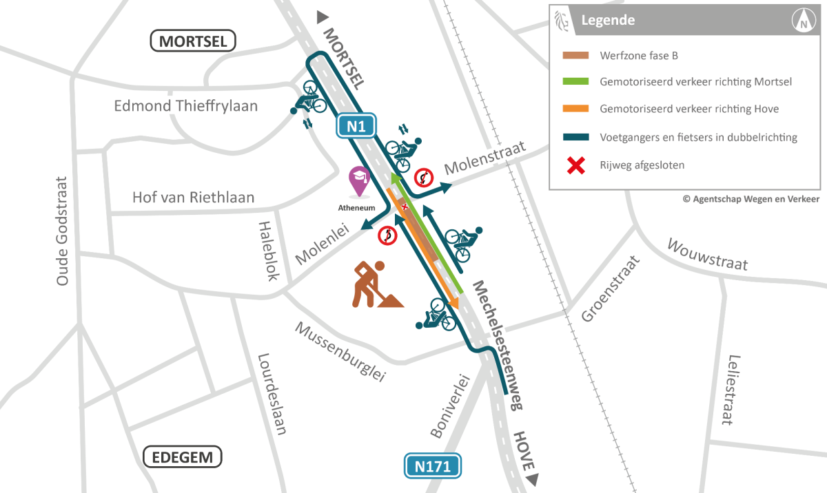 De Molenstraat en de Molenlei blijven bereikbaar, maar kan je enkel rechts uitrijden en rechts inrijden. Om de Molenstraat te bereiken vanuit Mortsel, moet het verkeer keren aan het kruispunt met de Hovestraat.