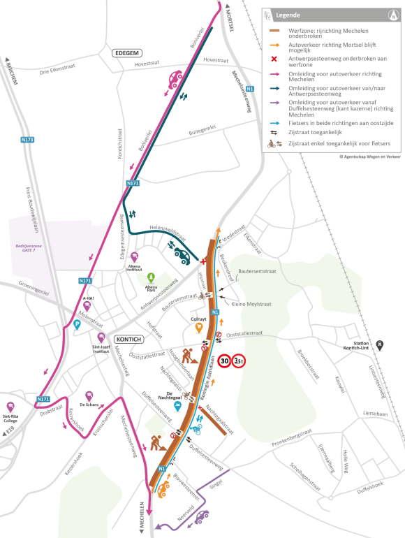 Verkeer van Mortsel/Edegem naar Mechelen volgt een omleiding via de Boniverlei (N171), Drabstraat, Keizershoek, Kruisschanslei en Mechelsesteenweg.