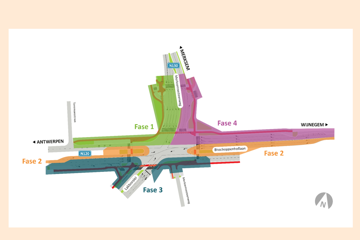 Verkeerssituatie op het kruispunt tijdens fase 3 (14 juni tot midden juli). © AWV |