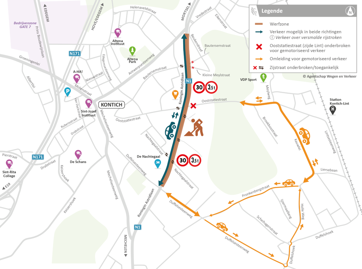 Fietsers en voetgangers kunnen de N1 van en naar de Ooststatiestraat oversteken. Gemotoriseerd verkeer naar Lint blijft de omleiding volgen via de Duffelsesteenweg, Duffelshoek, Holle Weg, Kapelstraat en Kauwlei. Voor verkeer naar Kontich geldt nog steeds de omleiding via de Kauwlei, Pronkenbergstraat en de Duffelsesteenweg.