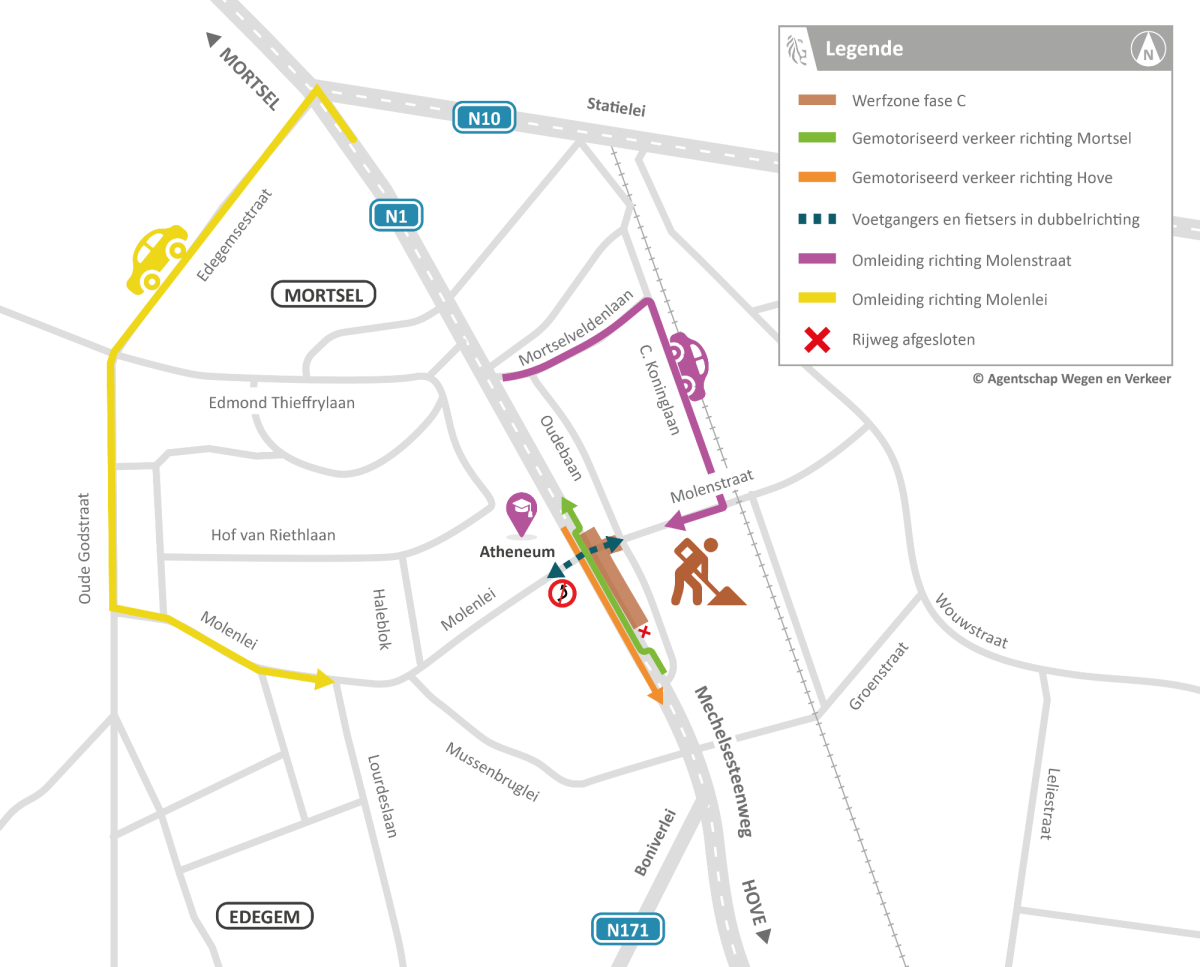 De Molenlei blijft bereikbaar. Je kan de Molenlei enkel rechts inrijden (vanuit Mortsel) en rechts uitrijden (richting Hove). Verkeer vanuit Hove met bestemming Molenlei volgt de omleiding via Mechelsesteenweg, Edegemsestraat en Oude Godsstraat.