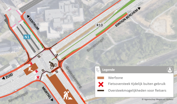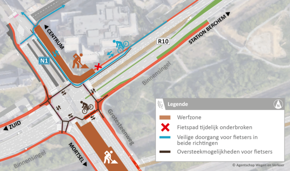 Van 22 tot en met 27 augustus moeten we ook het kruispunt met de Binnensingel afsluiten. Enkel verkeer van de afrit (R1) naar Berchem station is dan mogelijk. De oprit (R1) naar Nederland blijft bereikbaar komende van Mortsel.