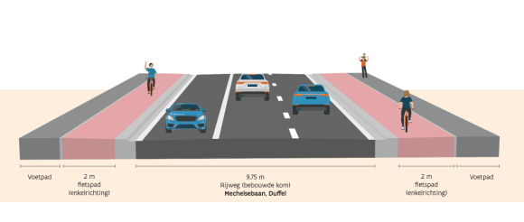 Het wegdek is aan vernieuwing toe en de fietspaden zijn vandaag niet gescheiden van de rijbaan. Om de verkeersveiligheid en het rij- en fietscomfort te verhogen, passen we het wegdek en de fietsinfrastructuur volledig aan over een afstand van ca. drie kilometer. Buiten de bebouwde kom leggen we brede en nieuwe fietspaden die we scheiden van de rijweg door een gracht. Binnen de bebouwde kom komt er een nieuw fietspad aanliggend aan de rijweg. Daarnaast krijgt het kruispunt van de Mechelsebaan en Berkhoevelaan verkeerslichten. |