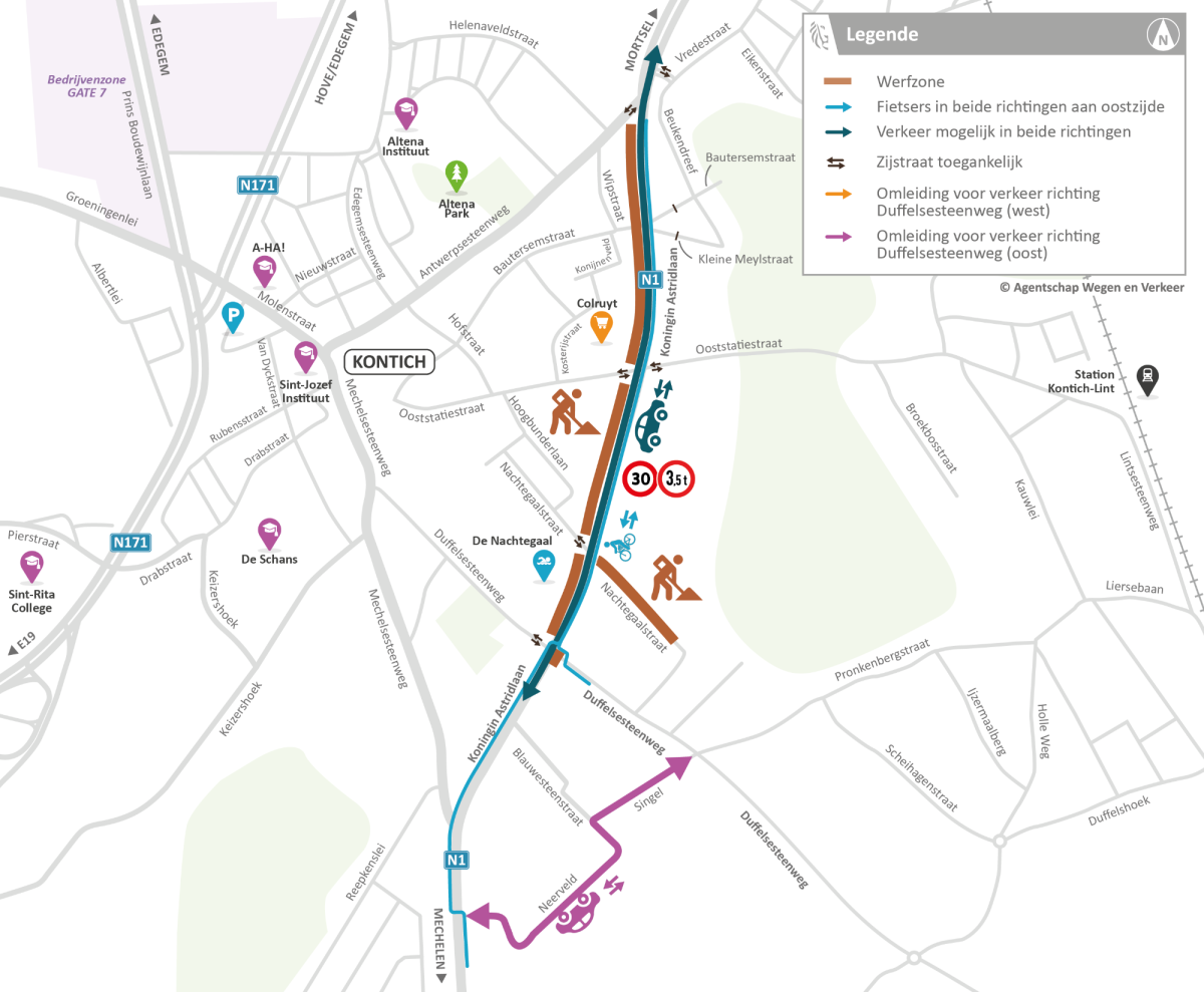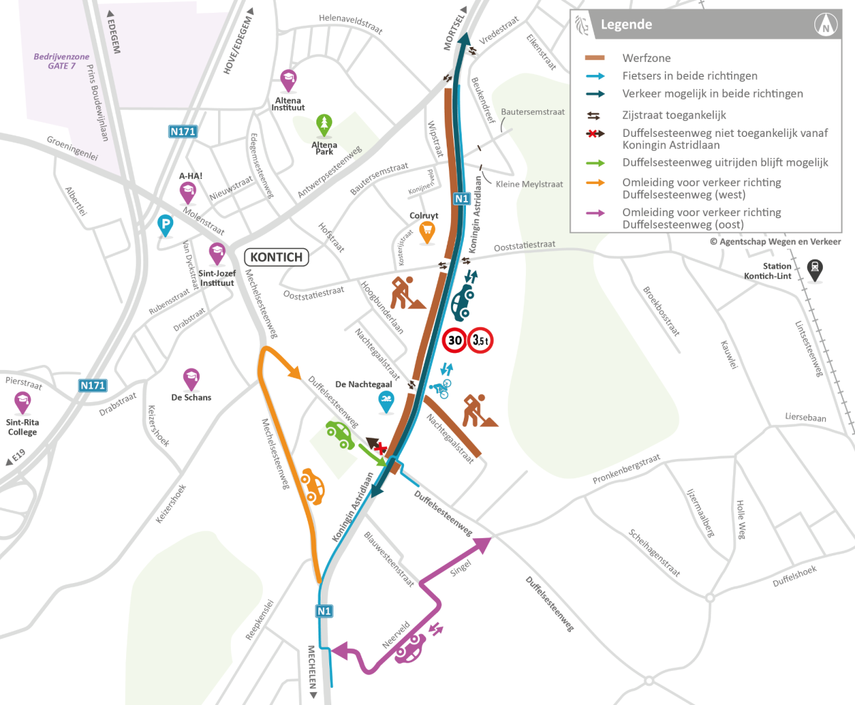 - De situatie aan de westzijde van de Duffelsesteenweg blijft hetzelfde: je kan uitrijden naar de N1, maar inrijden vanaf de N1 is niet mogelijk. Lokaal verkeer rijdt om via de Mechelsesteenweg en de Duffelsesteenweg. Vanaf 5 april vervalt deze omleiding en is het opnieuw mogelijk om de Duffelsesteenweg (westkant) in en uit te rijden.