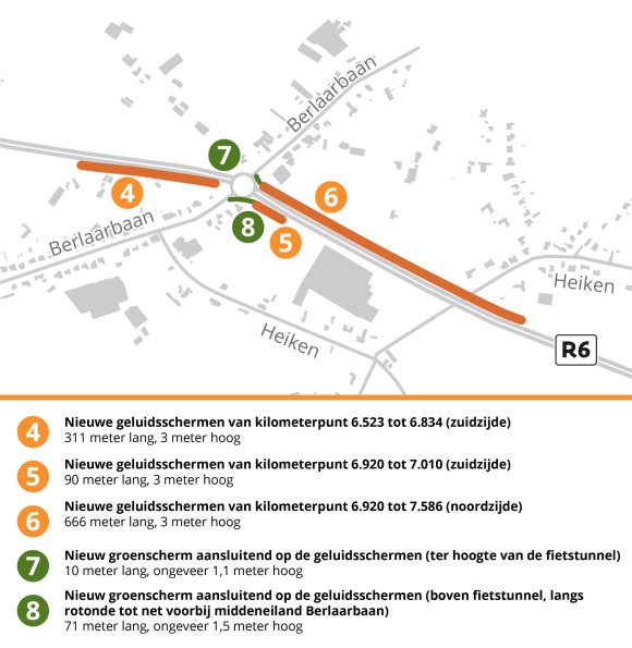 Naast de twee kilometer aan geluids- en groenschermen die we gaan plaatsen, komen er ook nog enkele ecopassages onder de R6, voeren we werken uit aan grachten en planten we extra bomen aan. In totaal voorzien we 3.161 m2 bijkomende boscompensatie. Tot slot gebeuren er enkele kleinere aanpassingen aan de waterafvoer ter hoogte van Heivelden. |