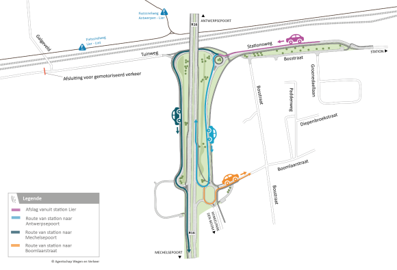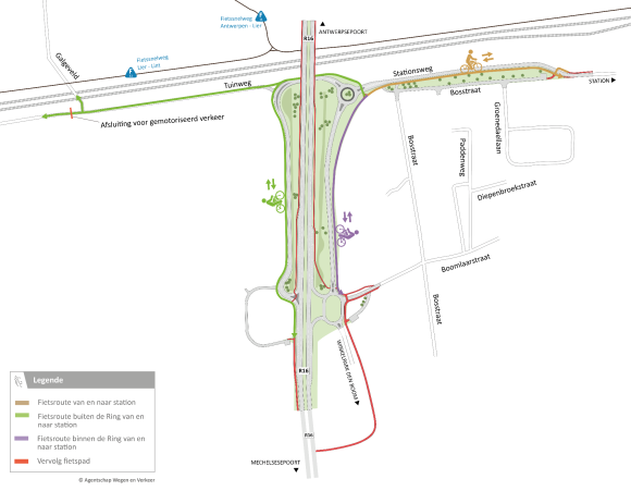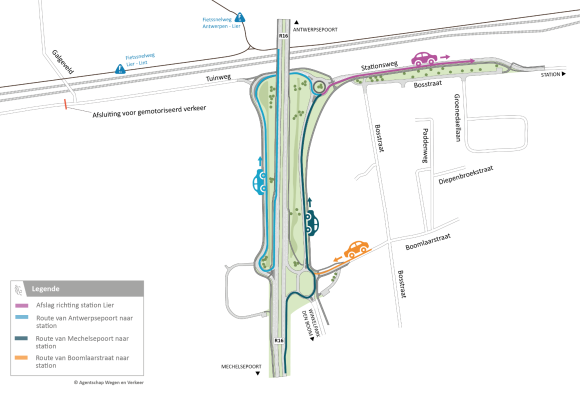De toekomstige ontsluitingsweg verbindt de Ring van Lier (R16) met het station. Zo ontstaat een vlottere verbinding naar het station voor pendelaars. Tegelijk vermindert de verkeersdrukte in de wijk rond de Boomlaarstraat. Naast de ontsluitingsweg liggen brede fietspaden, zodat ook de fietser zich veilig en vlot kan verplaatsen in de stationsomgeving. Die nieuwe weg zorgt voor een veiligere en betere organisatie van het verkeer naar het station en in de woonwijk rond de Boomlaarstraat. |