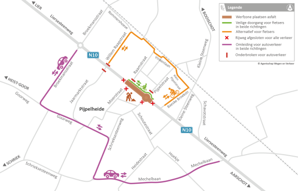 Hierdoor geldt tot midden mei eenrichtingsverkeer naar Lier op de N10. Verkeer naar Aarschot volgt tot dan de omleiding via de Broekmansstraat, Goorweg, Schrieksesteenweg, Grote Heidestraat en Mechelbaan. Fietsers blijven het fietspad aan de noordzijde in dubbelrichting gebruiken. |