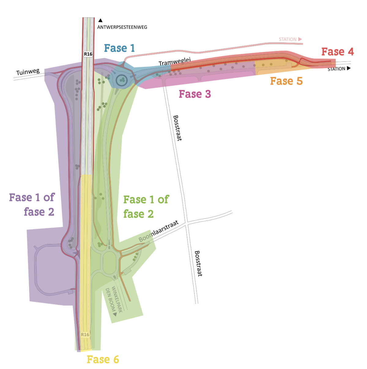 Zodra de nutswerken klaar zijn, starten dus de riolerings- en wegenwerken. Die werken delen we op in meerdere werfzones of fases. Je kan ze bekijken op onderstaand plan. In welke zone we starten, hangt niet alleen af van de resultaten van het archeologisch onderzoek, maar ook van de werken die de stad plant in de Bosstraat. Tegen eind 2025 moeten alle werken klaar zijn.