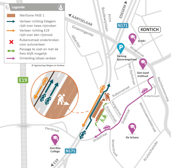 - Doorgaand verkeer vanuit Brussel en Mechelen naar Kontich, Hove en Edegem adviseren we om via de E19 afrit Rumst en de N1 te rijden.