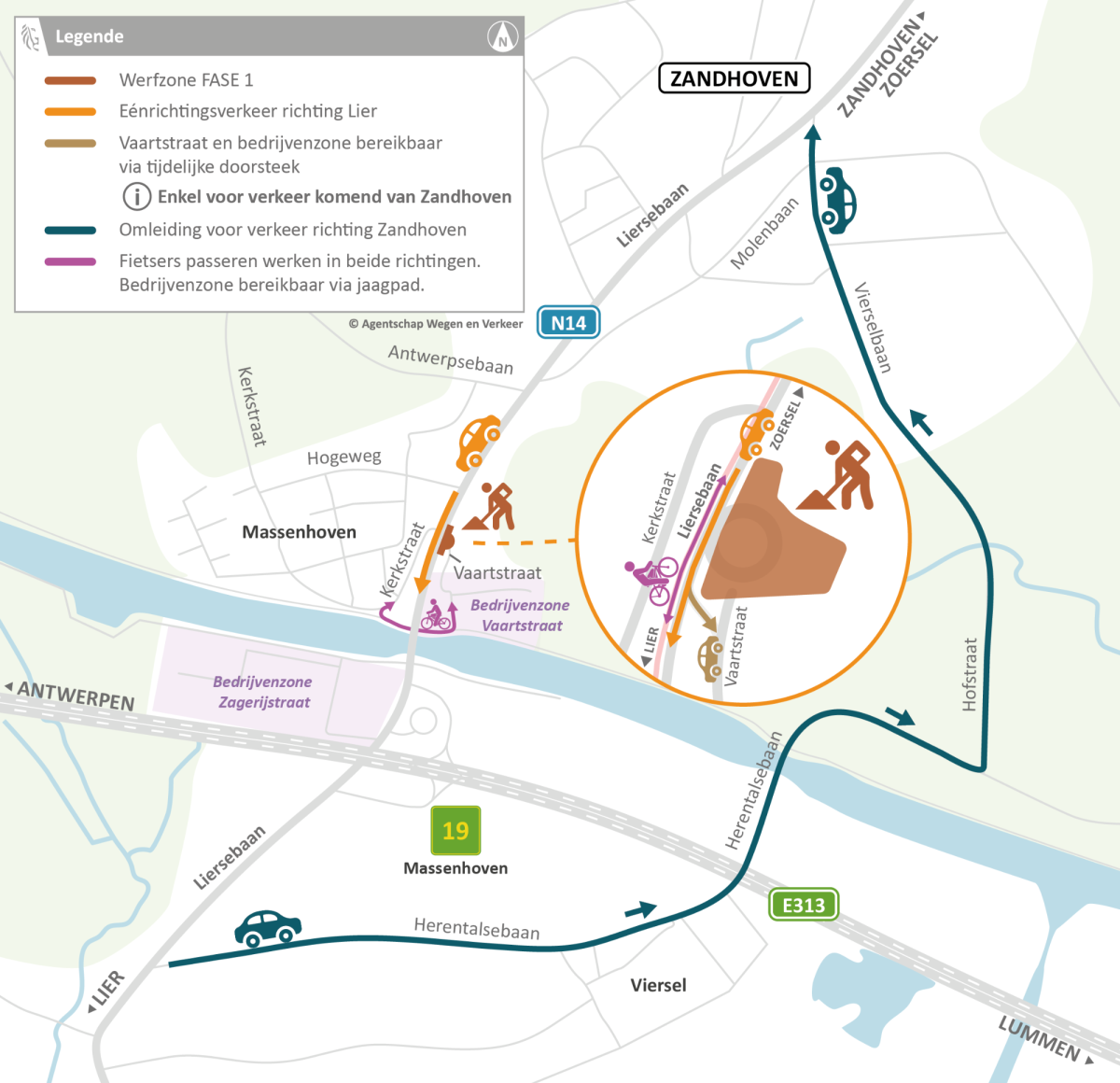 - Verkeer van Lier of van de E313 naar Zandhoven volgt een omleiding via de Herentalsebaan, de Hofstraat, de Vierselbaan en de N14. Verkeer op de E313 van Antwerpen naar Zandhoven, volgt best deze alternatieve route: E34 in Ranst en afrit Zoersel.