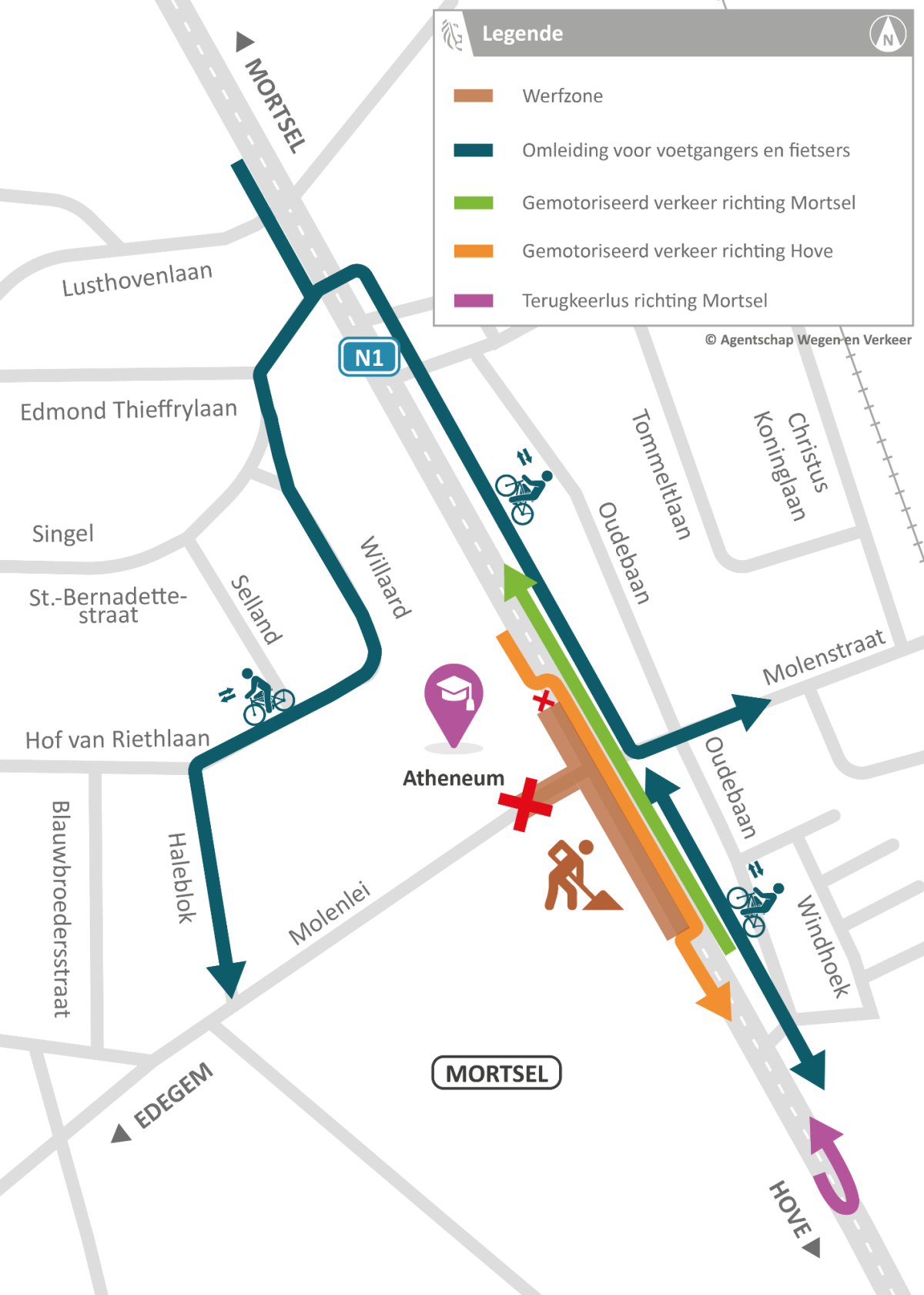 Doorgaand verkeer op de N1 blijft mogelijk in beide richtingen, maar op slechts 1 rijstrook in elke richting. Opgelet: van de Molenlei naar de Molenstraat rijden (en omgekeerd) is niet mogelijk. De Molenlei loopt dood op de N1. De Molenstraat blijft bereikbaar, maar kan je enkel rechts uitrijden en rechts inrijden. Vlak voor de Groenstraat is een terugkeerlus voorzien om zo de Molenstraat te bereiken vanuit Mortsel. Ook geldt aan de kant van de werken een parkeerverbod.
